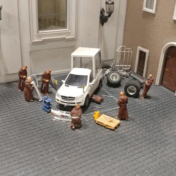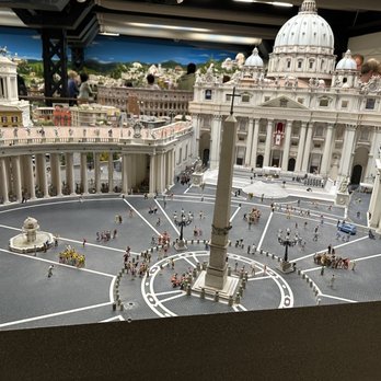 Picture a table-top miniature train set. Now expand it to the size of a warehouse. On two floors. And add hundreds of trains, thousands of vehicles, millions of little people. Everywhere you look, there's some interesting little detail. I spotted a dozen monks working on repairing the Popemobile. A guy operating a jackhammer that would bounce around. Two people hiding on a roof that were fighting.